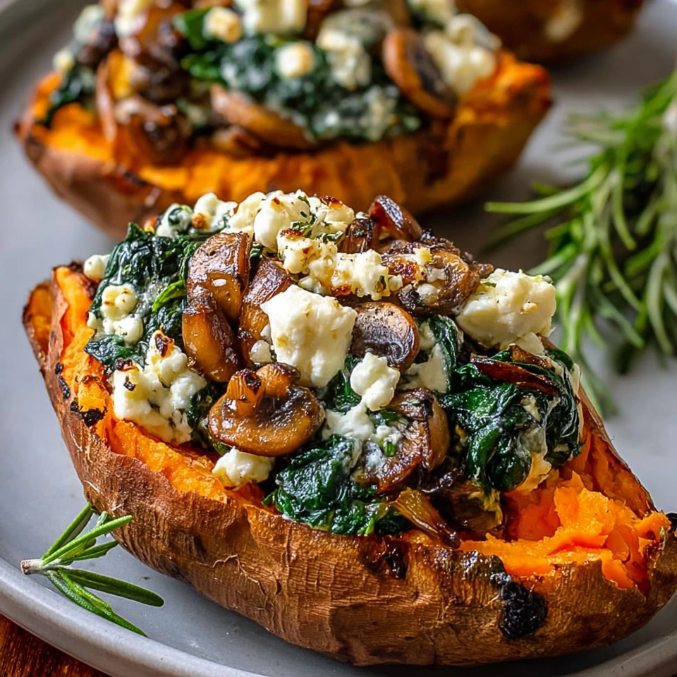 - Once the sweet potatoes have cooled slightly slice each open lengthwise down the center leaving the base attached so they hold together. Gently press the ends toward each other to make a pocket. Generously spoon the spinach mushroom feta mixture into each potato so it overflows a little.
